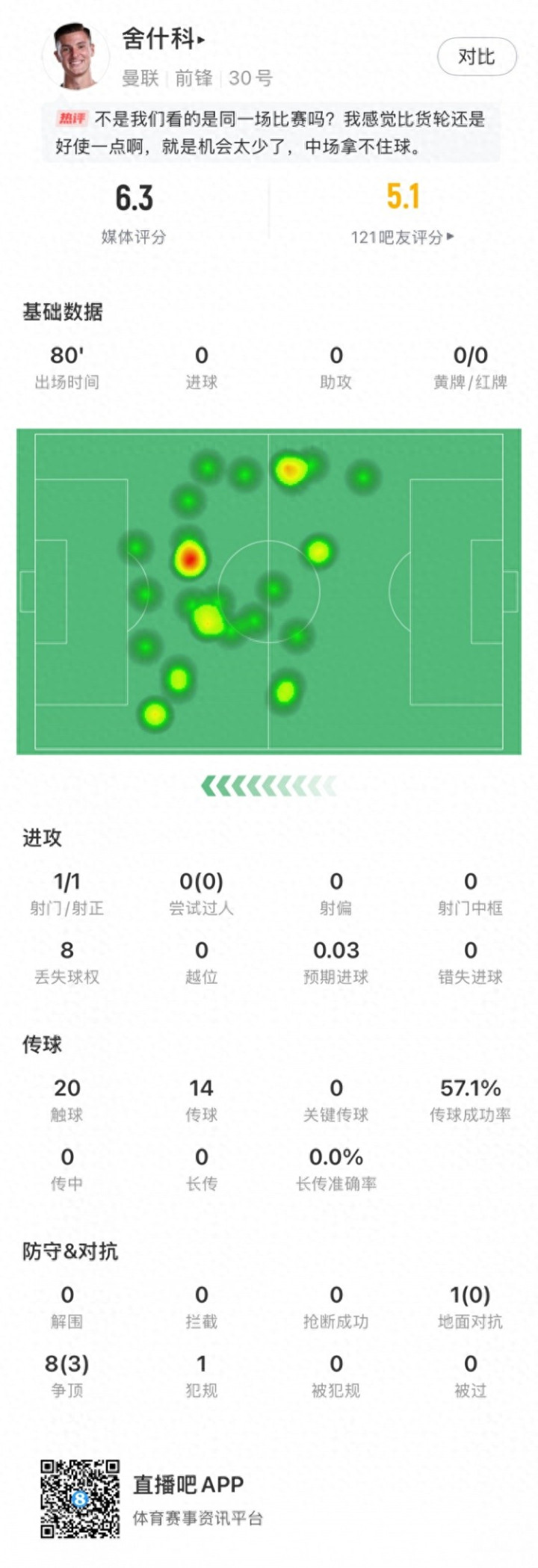 直播吧9月15日讯 英超曼市德比,曼联前锋舍什科首发出战,球员本场数据如下: