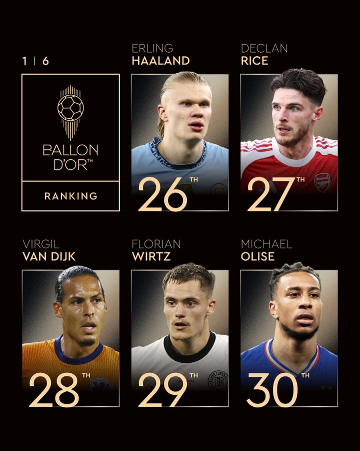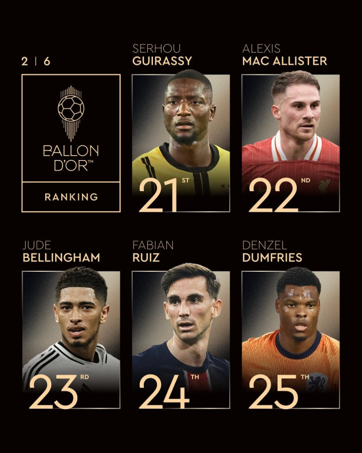 2025年《法国足球》金球奖颁奖典礼在巴黎夏特莱剧院进行。最终,登贝莱首次夺得金球奖。亚马尔和维蒂尼亚分列二三位。具体排名如下: