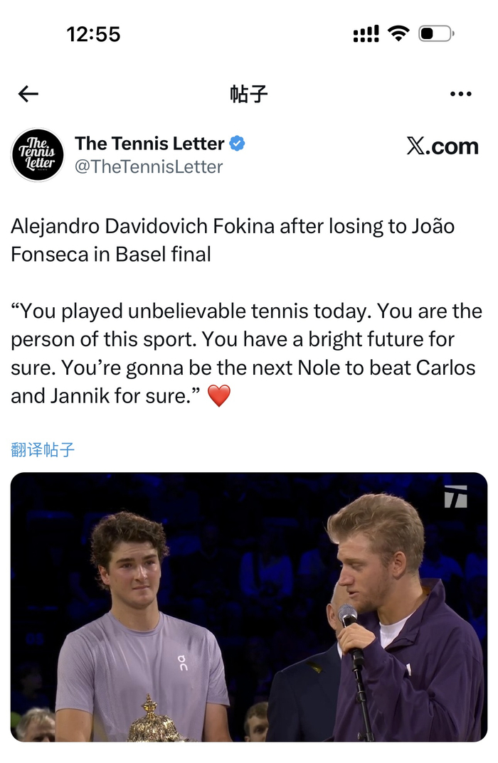 然而,赛后福基纳的表现赢得了全场观众的尊重。他在颁奖典礼上真诚地祝贺了丰塞卡,并给出了极高的评价:“恭喜丰塞卡,你打出了惊人的网球。以你的天赋和能力,我相信你将来会击败阿尔卡拉斯和辛纳这样的顶尖选手。”