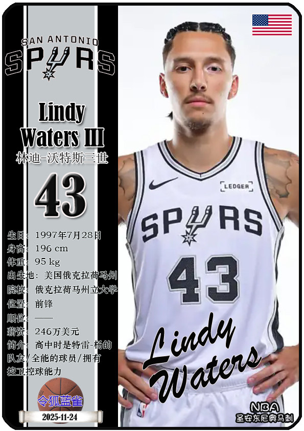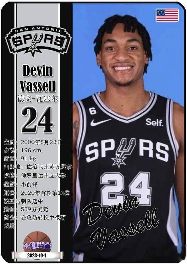 NBA圣安东尼奥马刺队的前身达拉斯灌木丛队成立于1967年,距今已有58年历史。截至2025年11月25日,球队主教练是米奇-约翰逊,队内拥有球员德阿隆-福克斯、德文-瓦塞尔、哈里森-巴恩斯、维克托-文班亚马等。本期以球星卡的形式展示目前NBA圣安东尼奥马刺队的18名球员(按球衣号码排序):