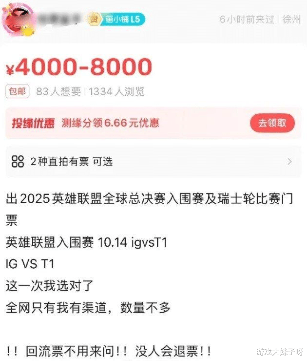 然而,在赛场尚未开打之前,另一场“争夺战”却已经提前打响——门票大战,官方定价388元的入围赛门票,短短几分钟就被抢购一空,更令人咋舌的是,黄牛的身影随即出现,二手票价格直接飙升至4000-8000元,翻了近20倍,原本一场全民狂欢的电竞盛宴,瞬间变成了少数人才能负担的“奢侈体验”。
